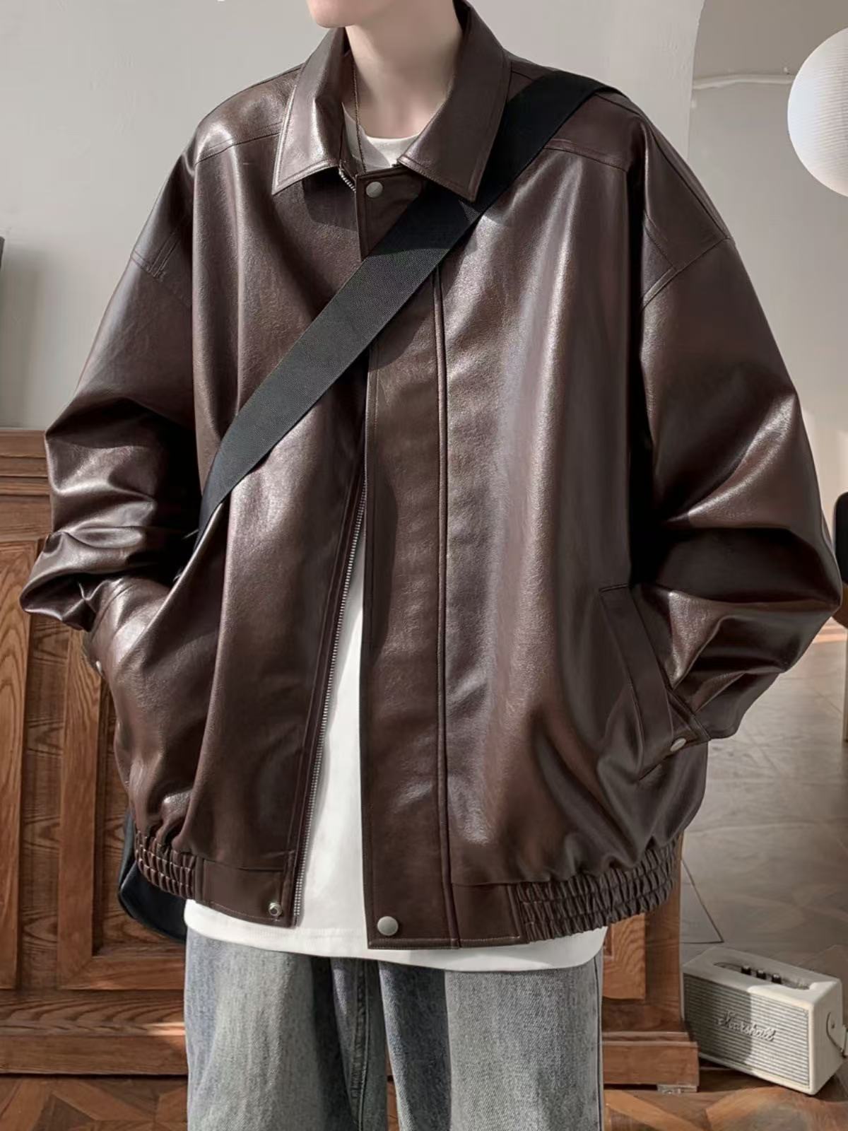 アメリカンレトロスタイルの革のアウター。男性用で、秋と冬に着る高級感があり、クールでスタイリッシュな潮牌、ゆったりした折り返し襟のジャケット